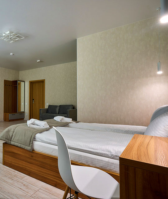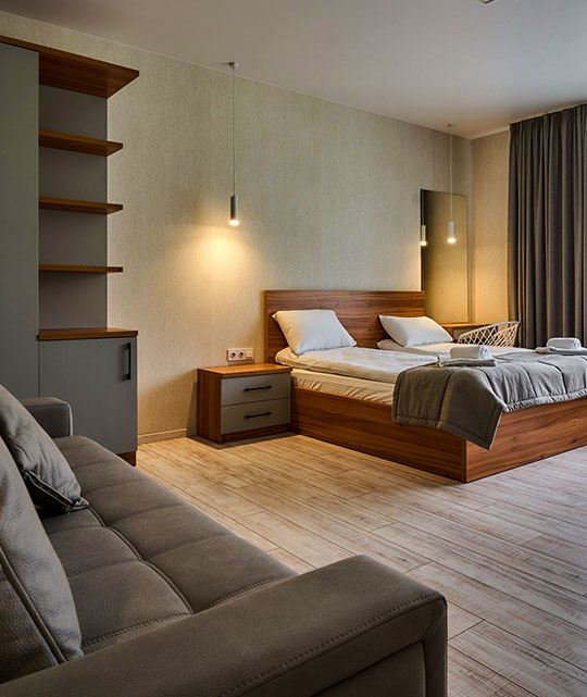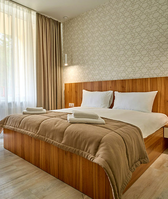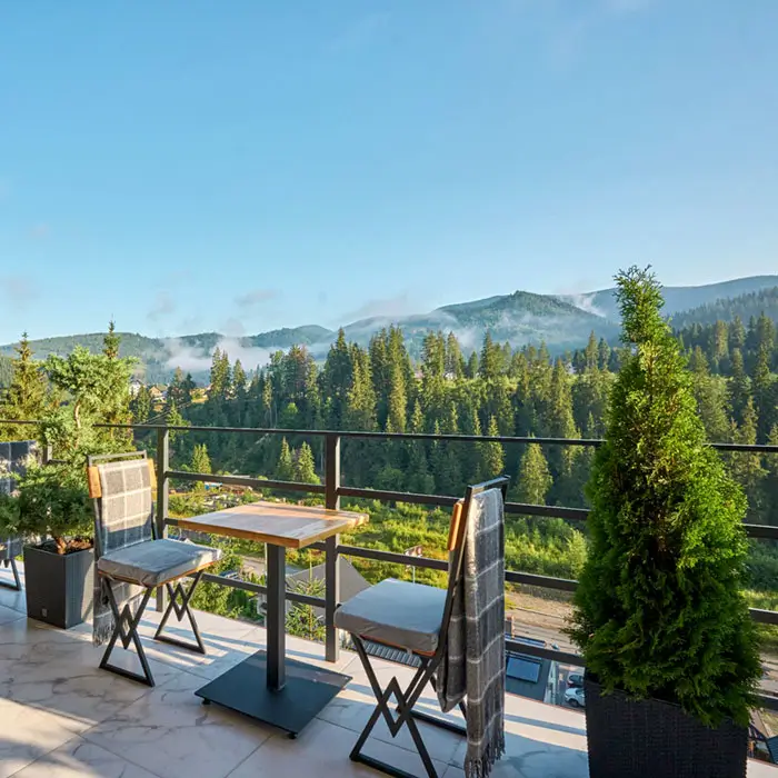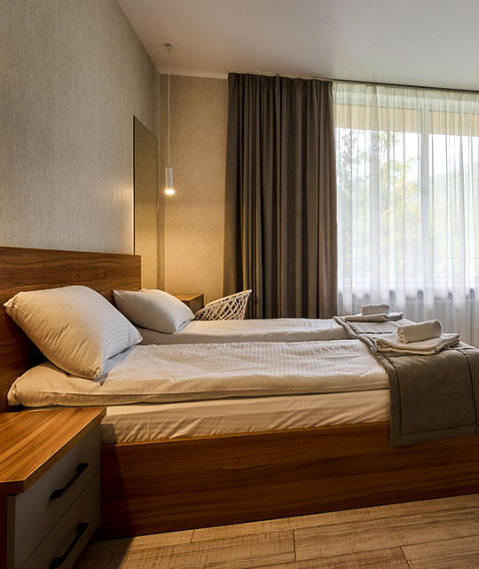 Світлі просторі номери дозволяють насолоджуватися пейзажами безпосередньо з кімнати. Тут не потрібно шукати оглядові майданчики — Карпати відкриваються перед вами щодня.