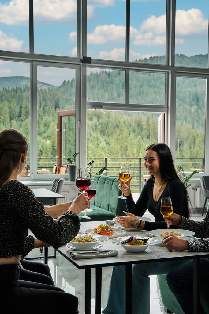 Вишукані страви карпатської та європейської кухні, натхненні природою гір та локальними традиціями. Атмосфера світла, простору й краєвидів доповнює кожну трапезу, перетворюючи її на окрему частину вашого відпочинку.