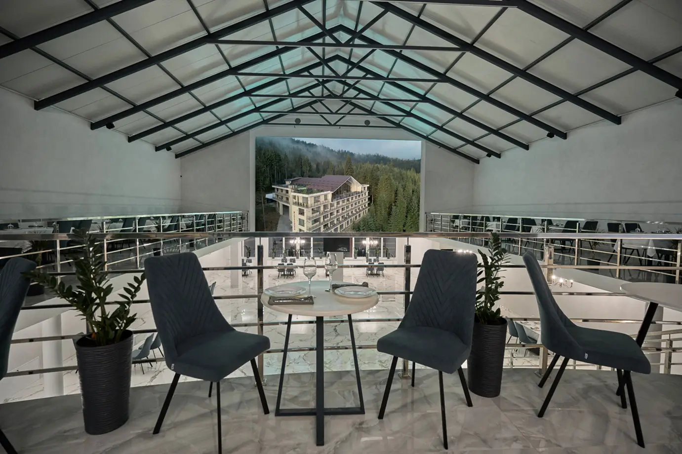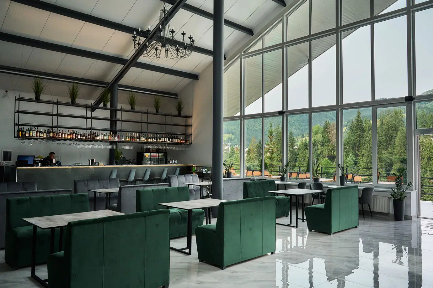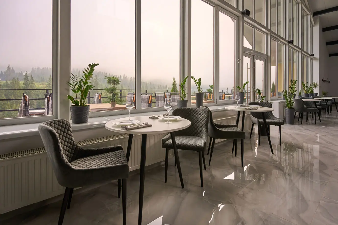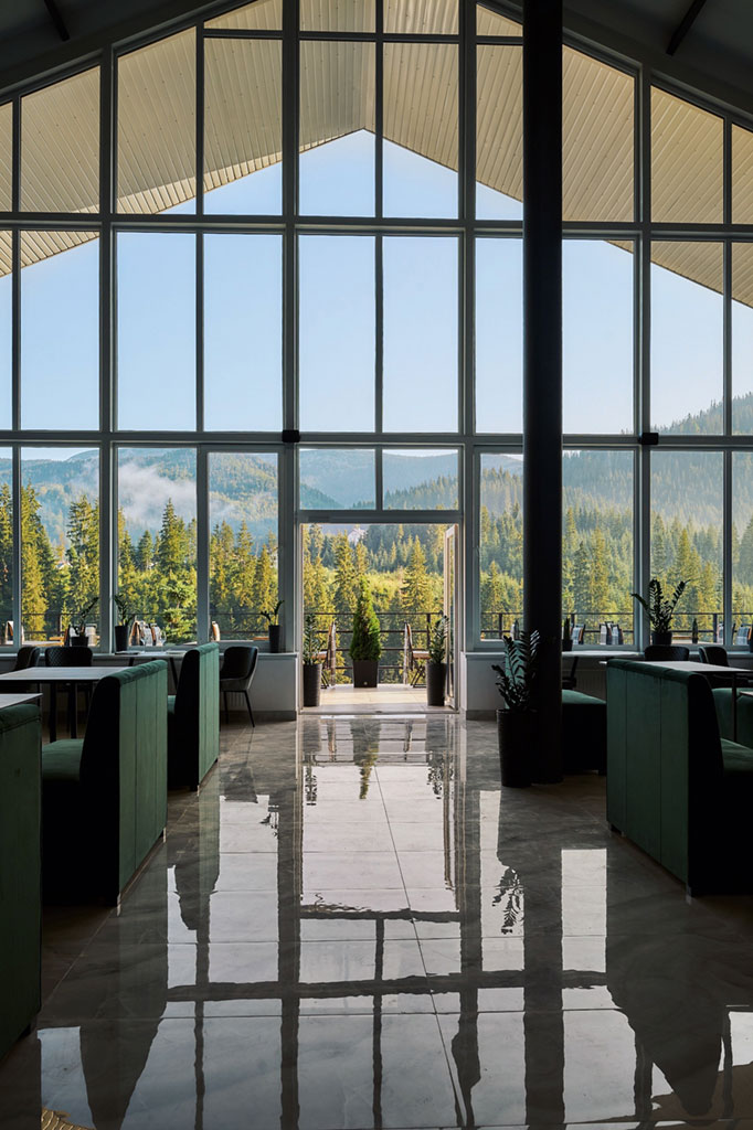 Світлий простір ресторану та краєвиди Карпат створюють атмосферу, в якій сніданок, вечеря чи святкова подія перетворюються на особливий момент відпочинку.