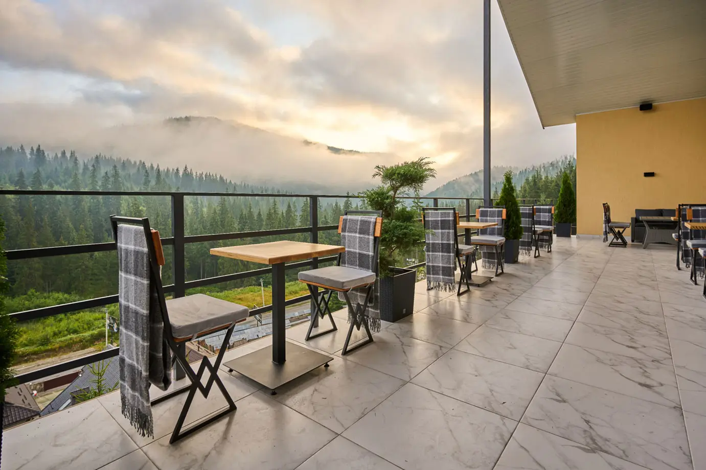 Дві просторі тераси дозволяють насолоджуватися гірськими пейзажами у будь-яку пору року. Пориньте у атмосферу справжнього гірського відпочинку. Тут Карпати відкриваються у своїй повній красі